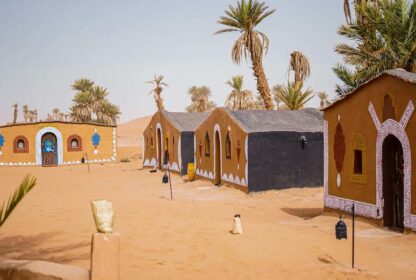 En fin de matinée, vous atteignez M’Hamid, dernier village avant l’immensité désertique. Un déjeuner au bivouac fixe au cœur de la palmeraie vous permet de vous installer et de vous détendre après le voyage, tout en découvrant les environs paisibles.
