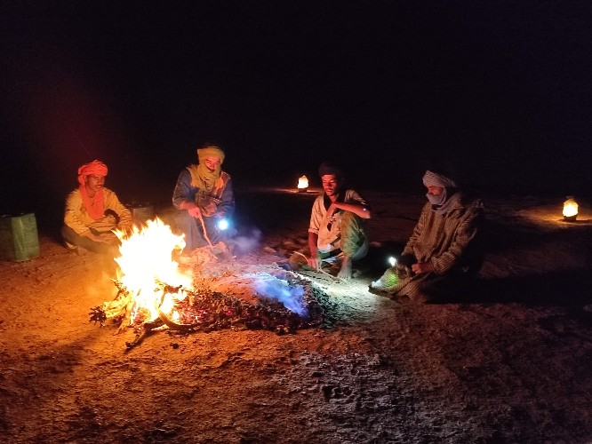 • Soirée au coin du feu : Dîner traditionnel, chants nomades et nuit sous les étoiles ou en tente, dans le silence absolu du Sahara.